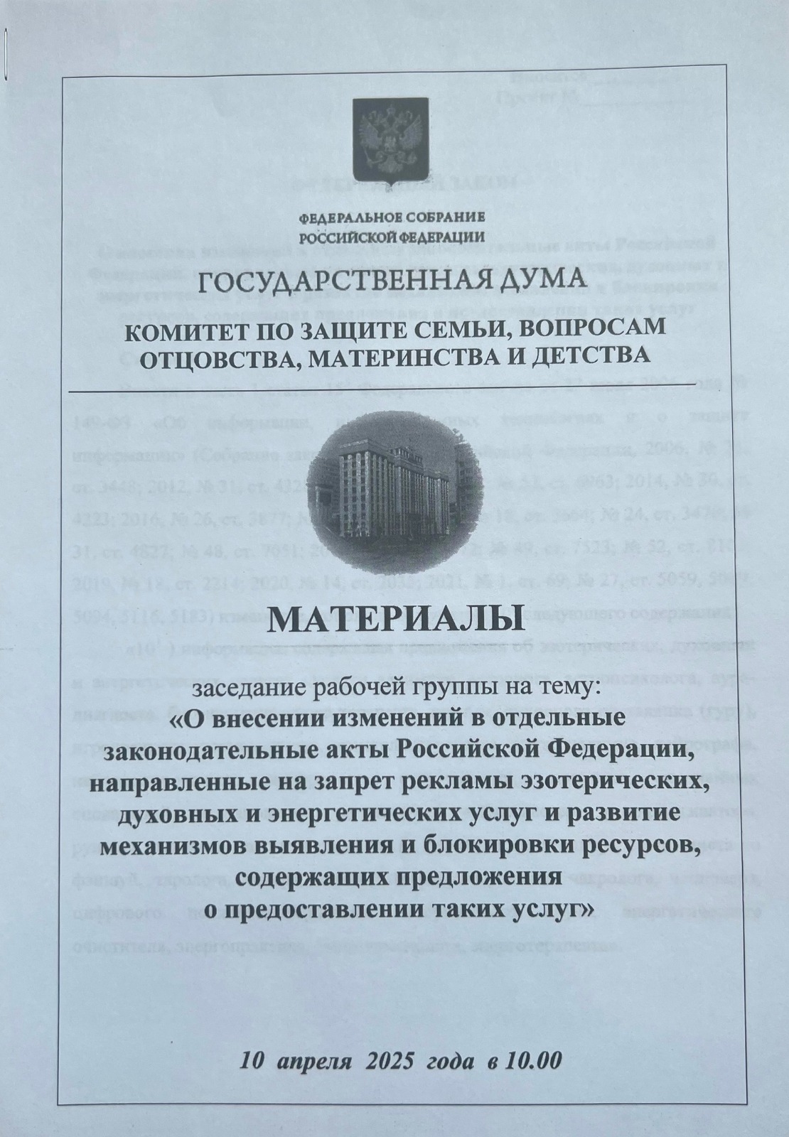 11 апреля 2025 года Руководитель МЦИТК Лобарев Алексей Юрьевич был приглашен на заседание рабочей группы Комитета по защите семьи, материнства и детства Государственной Думы РФ, где обсуждались изменения в законодательстве, направленные на запрет рекламы эзотерических, духовных и энергетических услуг.